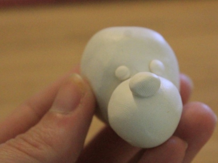 Next, let’s start with marzipan. To begin with, we will cover our biscuit with most of it, and leave to cool. But from the remnants, let’s start creating. We sculpt one ball, one oval and three small beads – we begin to sculpt the dog’s face.