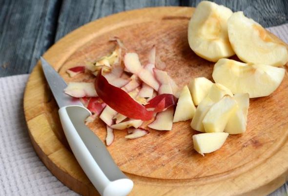 Core the apple and peel it. Cut the apple into large pieces. Cut the carrots into a thin semicircle.