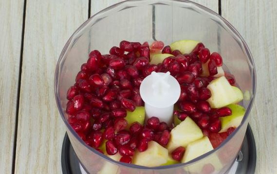 Wash the apple, cut it into 4 parts, and remove the core. Cut the peeled pulp into small slices. Combine grapefruit slices, diced apples, and pomegranate seeds in a blender bowl.