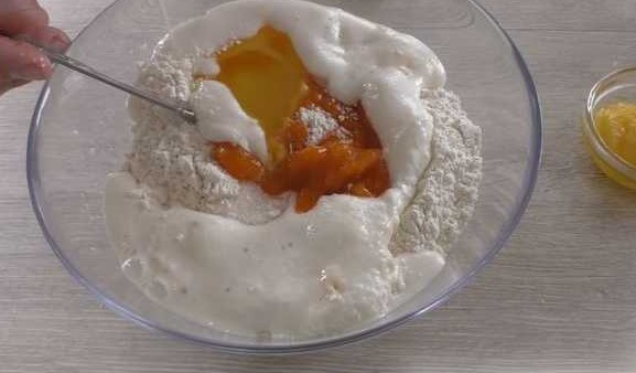 This also includes salt, remaining sugar, apricot pulp and an egg. We mix.