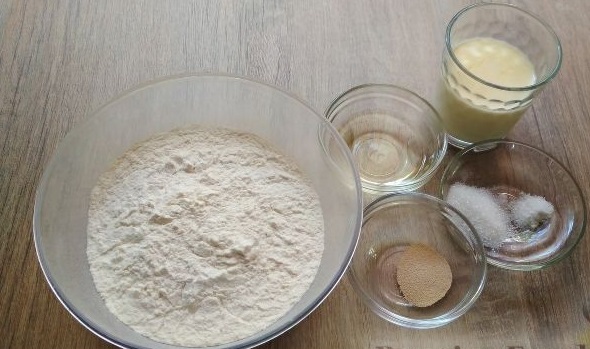 Cooking the dough. Add sugar, salt, yeast, vegetable oil, milk to the flour and knead the dough.