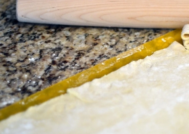 Roll out the dough with a rolling pin. Sprinkle it with flour so that the dough does not stick.