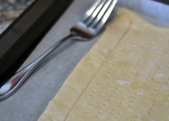 We line baking paper on a baking sheet and put our dough sheet on it. Using a knife, remove excess dough and make holes over the entire area with a fork. And we send the baking sheet to an oven preheated to 200 degrees for 10-15 minutes.