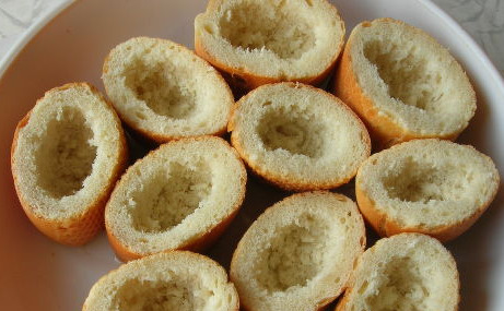 Cut the baguette into pieces 5-7 cm wide. Take out the crumb from each piece, but in such a way that the bottom remains. We put it in a heat-resistant form, oiled.