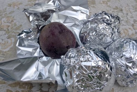 We wash the beets, wrap them in foil and place them in a preheated oven. We check the readiness of the beets by piercing them with a knife. The beets should be soft. My beets were baked for 1 hour 30 minutes.