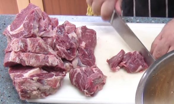Cut 2.5 kilograms of beef entrecote into a shashlik, cubes with a side of about 2 centimetermetres, weighing about 20 grams.