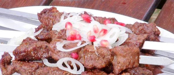 Sprinkle the finished beef entrecote shish kebab with pickled onions, pomegranate seeds and serve with a fresh flatbread.