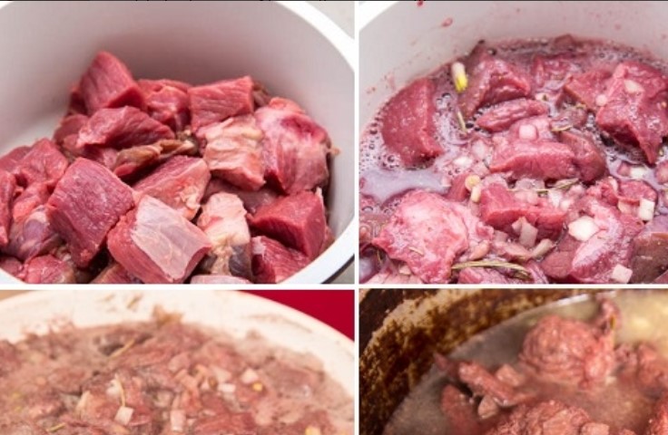 Wash the meat, cut into cubes. Add chopped onions, salt, spices, wine. Stir and leave to marinate for a couple of hours. Then send to the pan and simmer over low heat for about half an hour. Transfer to a heavy-bottomed dish, add butter and a glass of water. Simmer for 1-1.5 hours over low heat until soft.