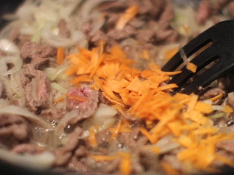 For the meat we send onions (cut into half rings) and carrots chopped on a grater.