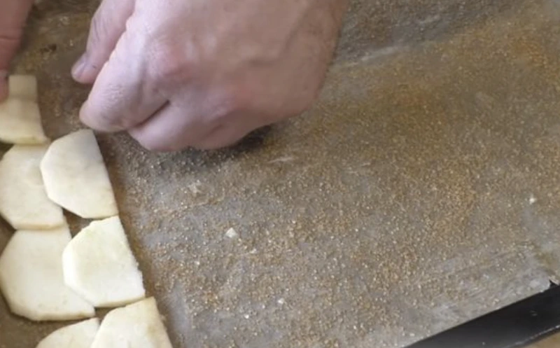 Immediately after baking, cover the baking sheet with a towel and turn over so that the apples are on top. We remove the parchment.