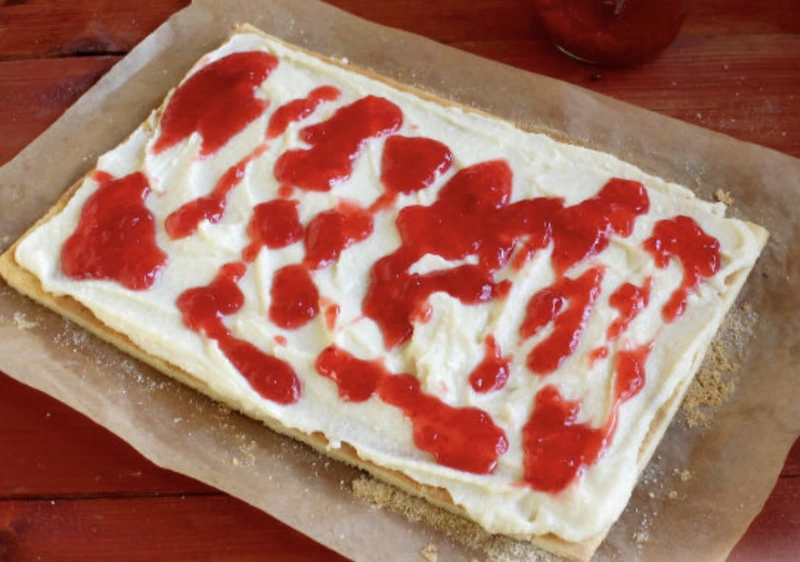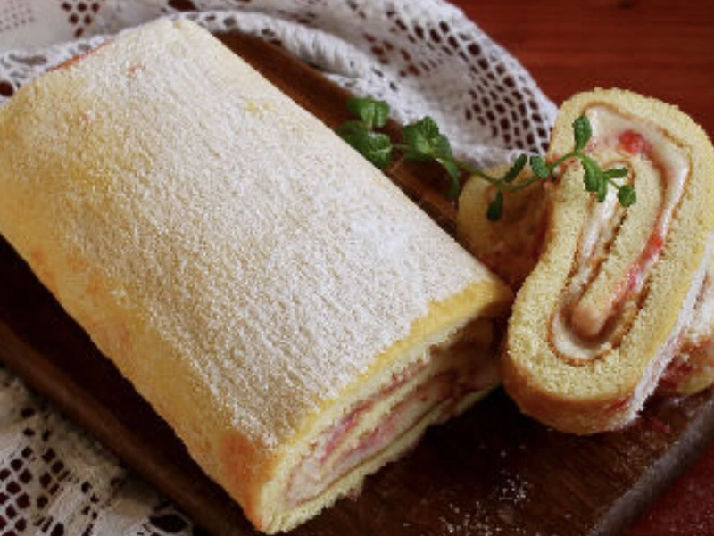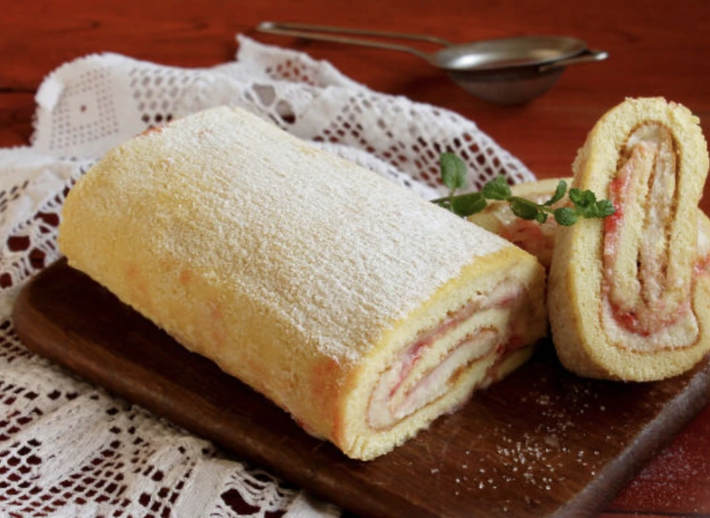 Homemade biscuit roll with delicate buttercream and strawberry jam will decorate a children’s party, Sunday tea, or get-togethers with sweet-tooth girlfriends. The biscuit dough for the roll is not classic, but with the addition of milk.