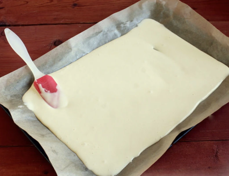 Pour the dough onto a rectangular baking sheet (35×45 cm) lined with oiled parchment. We bake the biscuit cake in the oven for about 15 minutes at 180 degrees.