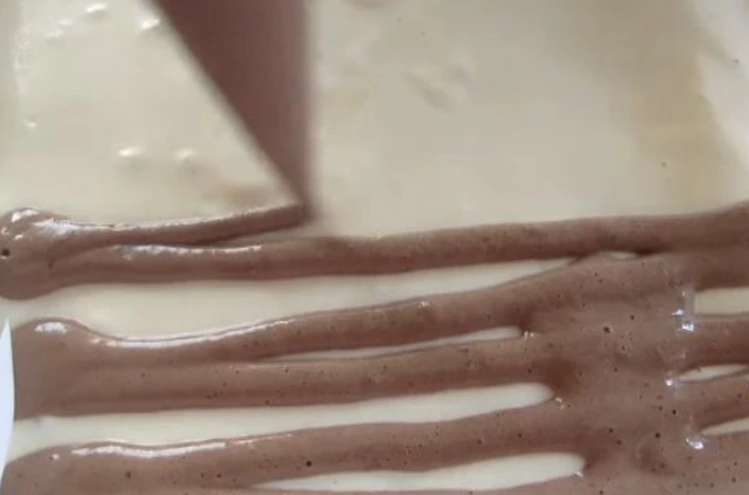 Mix the chocolate dough with the protein and put the light dough on top through a pastry bag. The dough is liquid, it spreads itself.