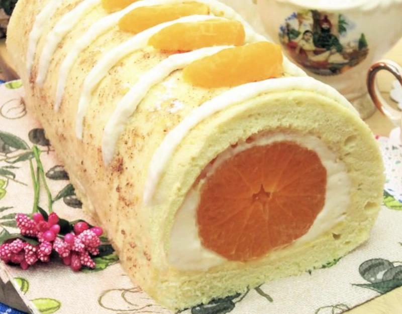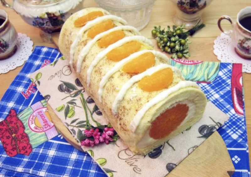 This original sponge roll with the bright mandarin filling will decorate any festive table. Juicy tropical notes combined with delicate buttercream give the dessert a wonderful taste that will appeal to both young and adult sweet lovers.