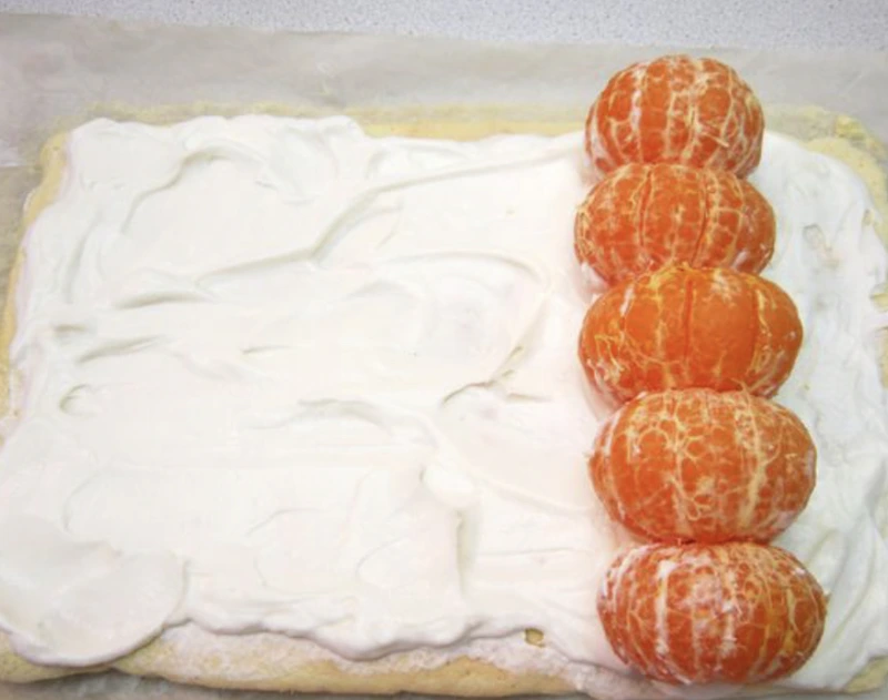 Apply butter cream on the cooled cake. A little cream can be left to decorate the roll. Having retreated from the edge about 5-7 cm, we spread the tangerines closely. I got a narrow cake on which 5 tangerines fit, so I disassembled the extra tangerine into slices and decorated the top of the roll.
