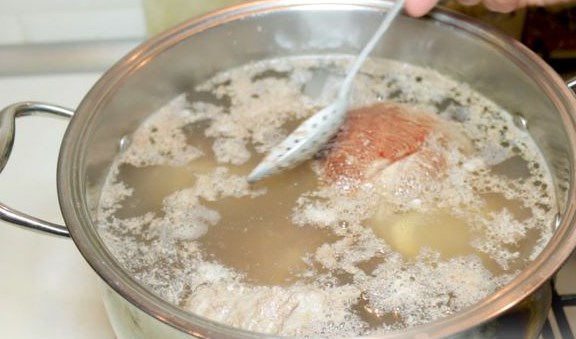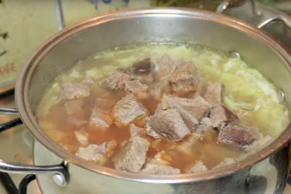 Borscht preparation begins with broth. For this, I use a beef shoulder and some beef ribs. For the recipe, I need about 1 kg of meat. We wash the meat under running water. We place it in a saucepan, into which we previously poured 3 liters of cold water. We put the pan on medium heat and carefully monitor the broth – before boiling, it is necessary to remove the foam from it. When all the foam has been removed and the broth has boiled, cover the pan with a lid and cook the broth over minimum heat for 1.5-2 hours.