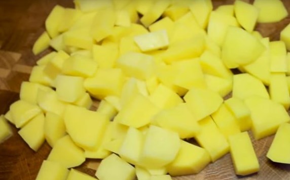 Dice five medium potato tubers. Cut 400 g of cabbage not very coarsely. By this time, the frying should be ready. We remove from the fire.