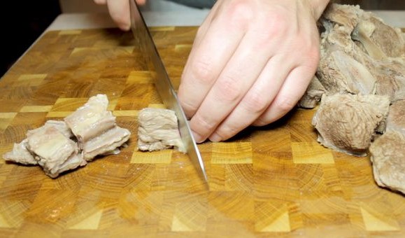 When the broth is cooked, remove the meat from it. We send potatoes to the broth and let cook for about 5 minutes. During this time, we separate the meat from the bones and cut it into pieces.