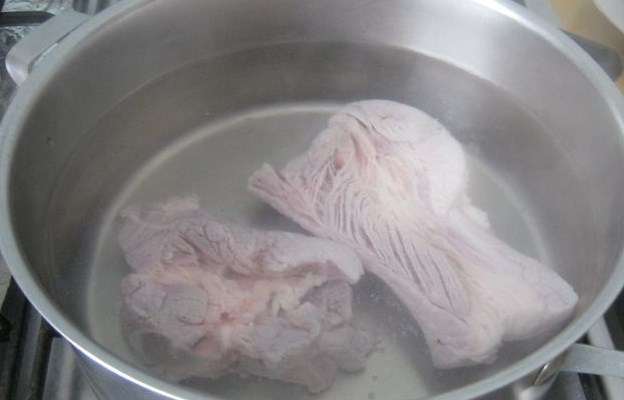 Cut pork ribs and wash. Boil 3-4 liters of water. Dip the meat in boiling water. Cook, covered over low heat for 30 minutes.