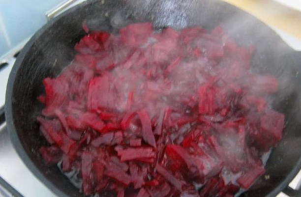 Cut the beets into strips. Heat a frying pan, add butter or vegetable oil. Simmer the beets for 3-4 minutes over medium heat.