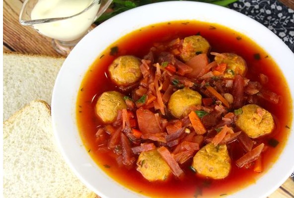 Usually, borscht is prepared on the basis of fatty meat. But sometimes you want to make this first course lighter. Today we are preparing borscht with chicken meatballs. It turns out no less tasty! A wide variety of vegetables, fragrantly spiced meatballs, rich broth, and fresh herbs – an amazing lunch!