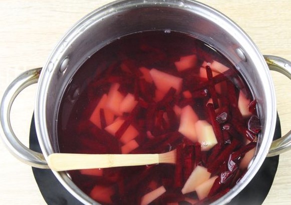 Meanwhile, chop the cabbage into thin strips. Send the cabbage to the pot with the beets and potatoes. Cook for 10 minutes.