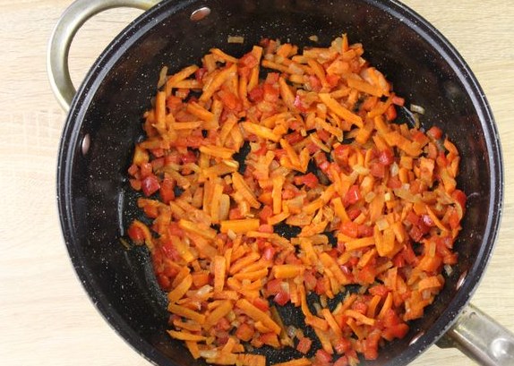 Heat a frying pan, pour in vegetable oil, and put onions. Sauté the onion, covered over medium heat, stirring occasionally, for 3 minutes (until translucent). Add carrots to the onion. Fry for 7 minutes (until the carrots are soft).