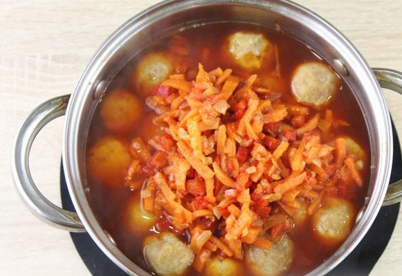 Then add the meatballs. Then put the fried vegetables from the pan into a saucepan. Cook for 5 minutes.