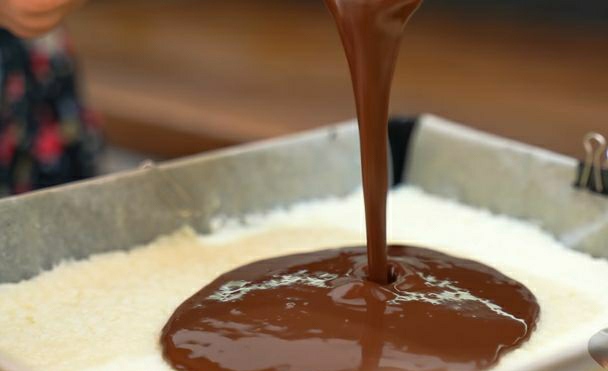 The frosting can be made from milk chocolate, it tastes very similar to the Bounty candies, as there is also a coconut filling in milk chocolate. And you can make a more budget-friendly icing from sour cream, cocoa and sugar. I made a soft chocolate frosting. To do this, you need to warm up the milk and pour chocolate over it. The more milk you have, the softer the glaze will be. Cover the cake with icing.