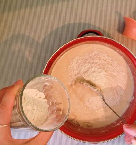 Add baking soda and oil. Add cheese. Add the rest of the flour and knead the dough.