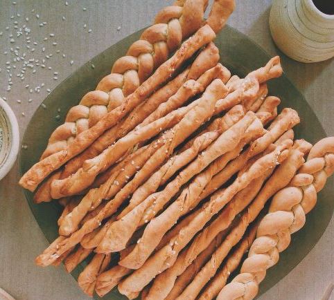 Cut off a small part from the dough, roll it into a layer, 2-3 mm thick. Sprinkle sesame seeds on the layer, press it into the dough with a rolling pin. Cut into strips 3-5 cm wide, twist them.