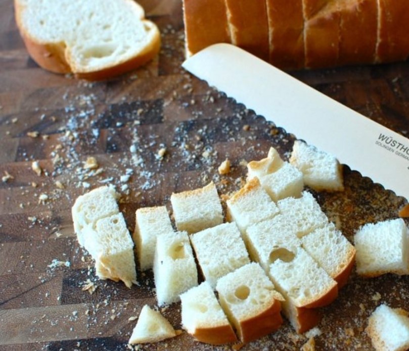 Cut the bread into slices, then cut each into small squares or tear into free-form pieces