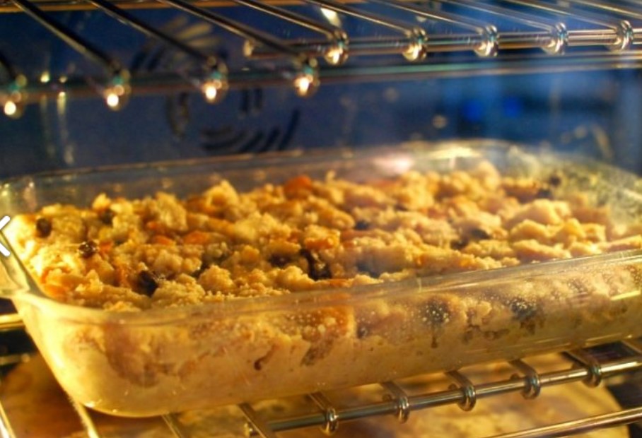 Put the bread in a large bowl, add the raisins and pour in the milk mixed with the rest of the ingredients, stir and leave for a while so that the bread absorbs most of the liquid.