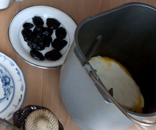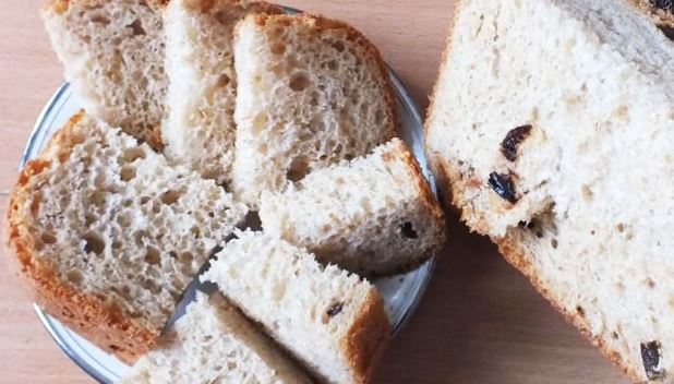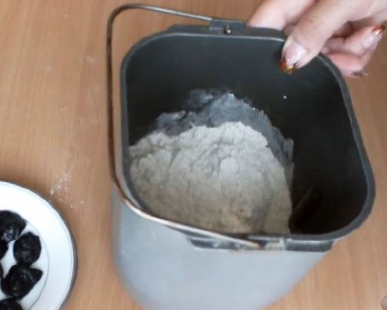 Homemade bread made from yeast dough on kefir, rye, and wheat flour, with the addition of prunes. Bread is baked in a bread maker.