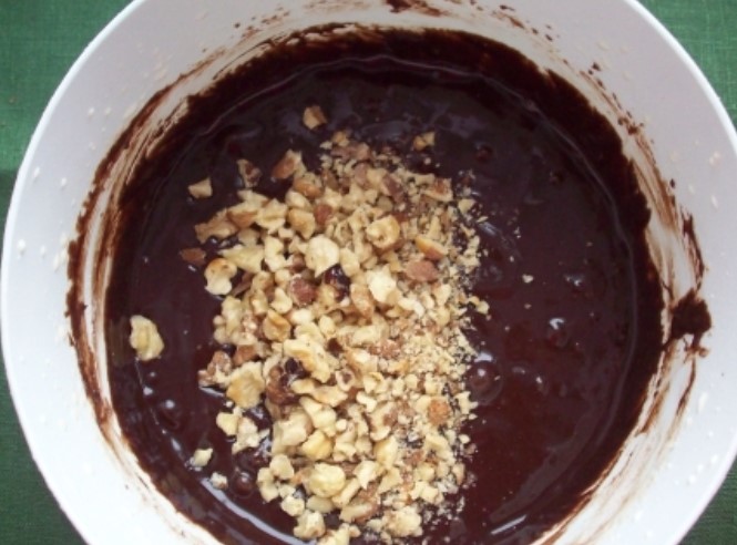 Pour small pieces of walnuts into the bulk of the dough. Now mix thoroughly.