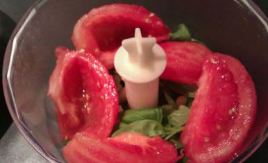 She peeled the tomato and scalded it with boiling water. She also peeled the seeds from the tomato, cutting it into four parts. I put basil leaves, a clove of garlic, almonds, a pinch of salt, and a tomato into the grinder. I will prepare the pesto alla Trapanese (like in Trapani).