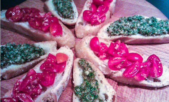 You say pesto, but pesto can be different. In this recipe, bruschetta is prepared with pesto alla Trapani (as in Trapani), which is composed of basil, tomatoes, garlic almonds, and grated pecorino cheese.