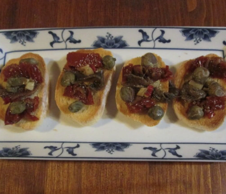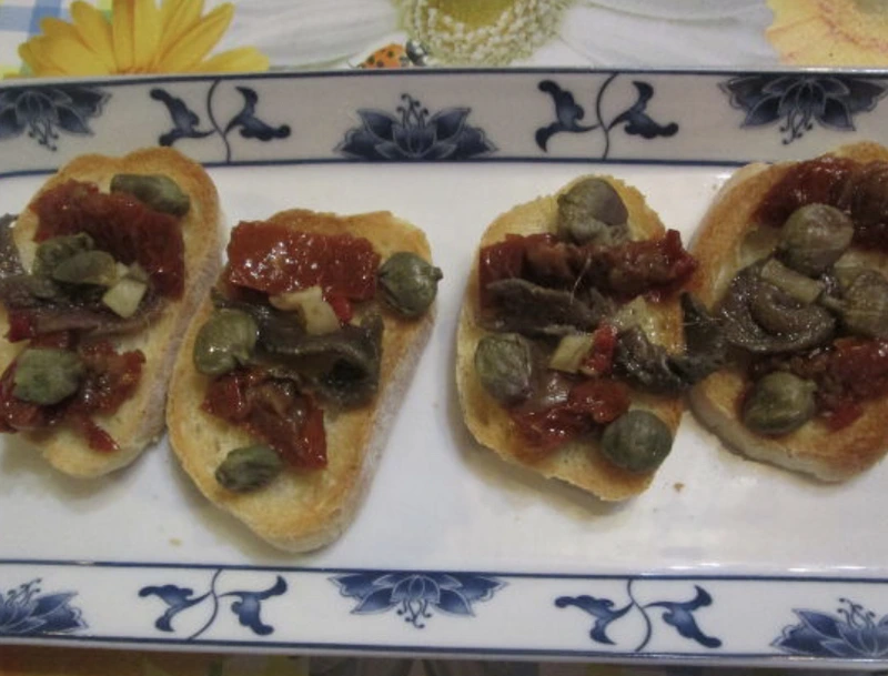 Mouth-watering bruschettas with spicy anchovies, sun-dried tomatoes, and capers serve as an antipasto or as a spicy snack. Gifts from the south of Italy for you!