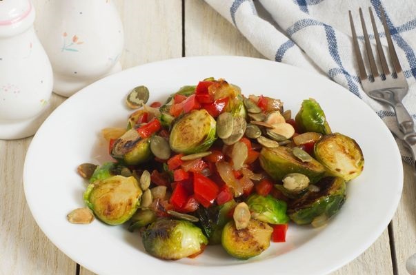 Brussels Sprouts Fried with Bell Peppers, Onions and Pumpkin Seeds