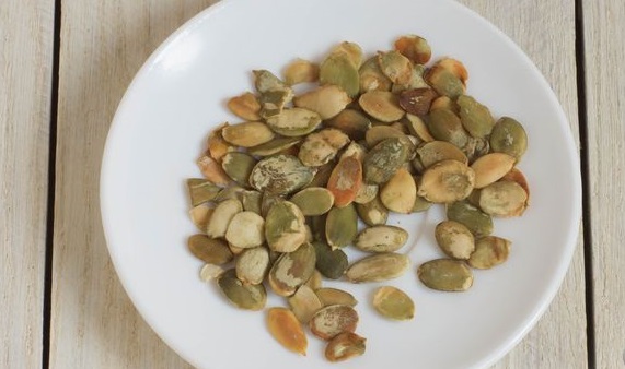 Fry the pumpkin seeds for 2-3 minutes in a dry skillet, stirring frequently, over medium heat. The seeds should be lightly browned. Transfer the finished seeds from the pan to a clean, dry plate to cool.