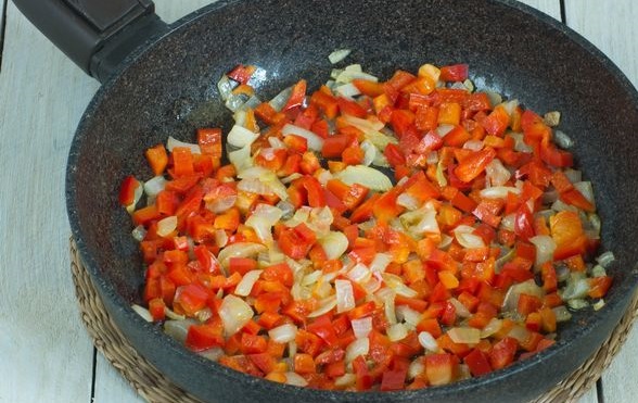 Peel the onion and cut into small cubes. Wash bell peppers, cut into two halves lengthwise, remove the inner part with seeds. Cut the peeled pulp into small cubes.
