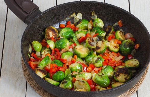 This light and original vegetable dish is made from Brussels sprouts cooked with sautéed onions and bell peppers! When serving, add lightly roasted pumpkin seeds, which will add nutritional value and a special taste to the dish!