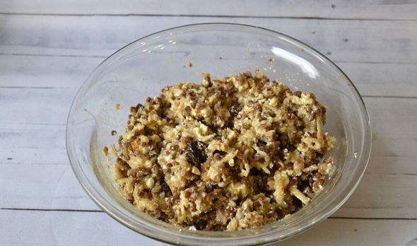 A baking dish (I have a square ceramic dish with a side of 20 cm.) Grease a piece of butter. Put the buckwheat mass in a mold and compact a little with a spoon.