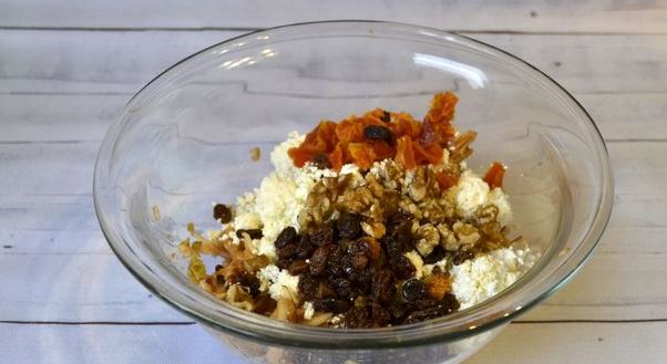 Drain the dried apricots and raisins. Pat dry fruit dry on a paper towel. Finely chop dried apricots. Chop the walnuts with a knife. Add raisins, dried apricots, and walnuts to a bowl. Turn on the oven to heat up to 180 degrees. Stir the ingredients in a bowl.