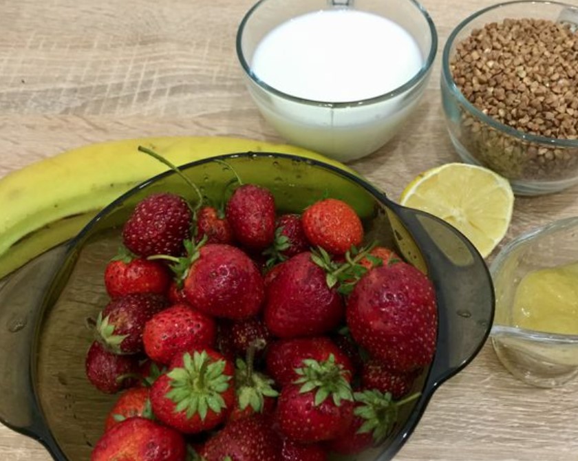 Pour strawberry puree into the center of the plate with buckwheat porridge. We decorate the porridge with strawberries, cut in half, and sprinkle with the buckwheat that had been set aside earlier. Serve buckwheat porridge with milk, strawberries, and banana for breakfast.