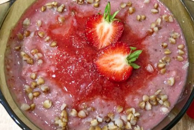 If the volume of the blender allows, then immediately combine all the ingredients in the bowl. If the blender bowl is small, first add only a third of the strawberry-banana puree to the buckwheat porridge.