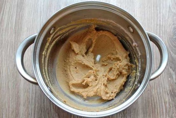 Stir in the buckwheat flour. Without stopping stirring, keep the dough on fire for about a minute. The dough should be smooth, smooth and without lumps. Remove the dough from heat and, while stirring, cool until warm.