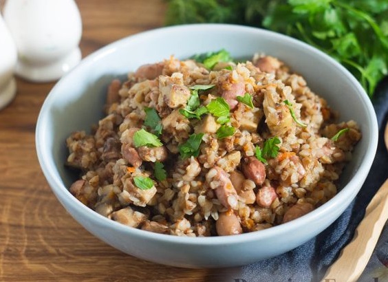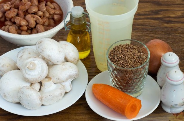 Simple buckwheat porridge with mushrooms and canned beans becomes a more interesting and nutritious dish. Prepared in one pan – buckwheat is saturated with juices and aromas of carrots, onions, mushrooms, and canned beans in tomato. A good option for buckwheat dishes for fasting and vegetarians!