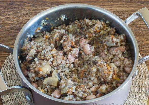 Serve buckwheat with mushrooms and canned beans, preferably immediately after cooking.