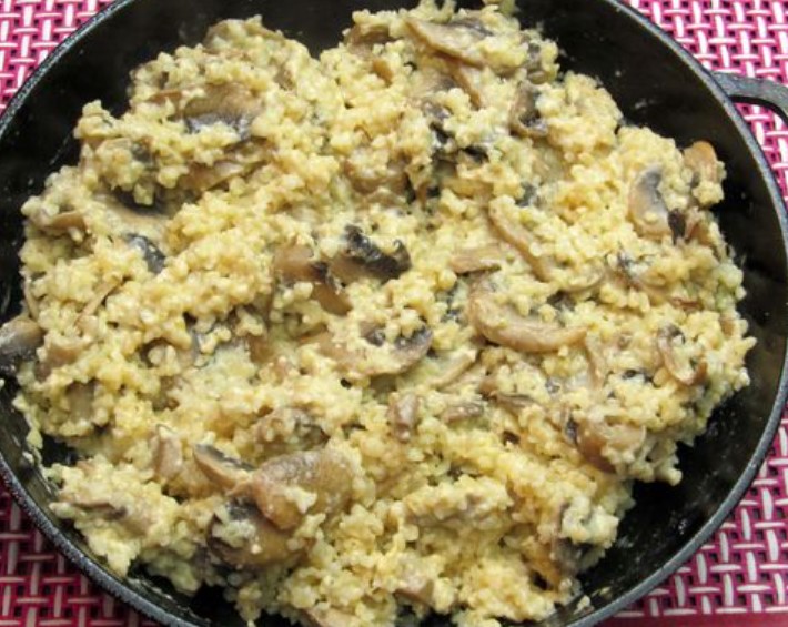 An interesting dish with a rich creamy taste, which is quite simple and quick to prepare. While bulgur is being cooked, the mushrooms are fried and then cooked with cream and grated cheese. Then everything comes together. Thanks to the exquisite sauce, bulgur gets a delicate, creamy texture.